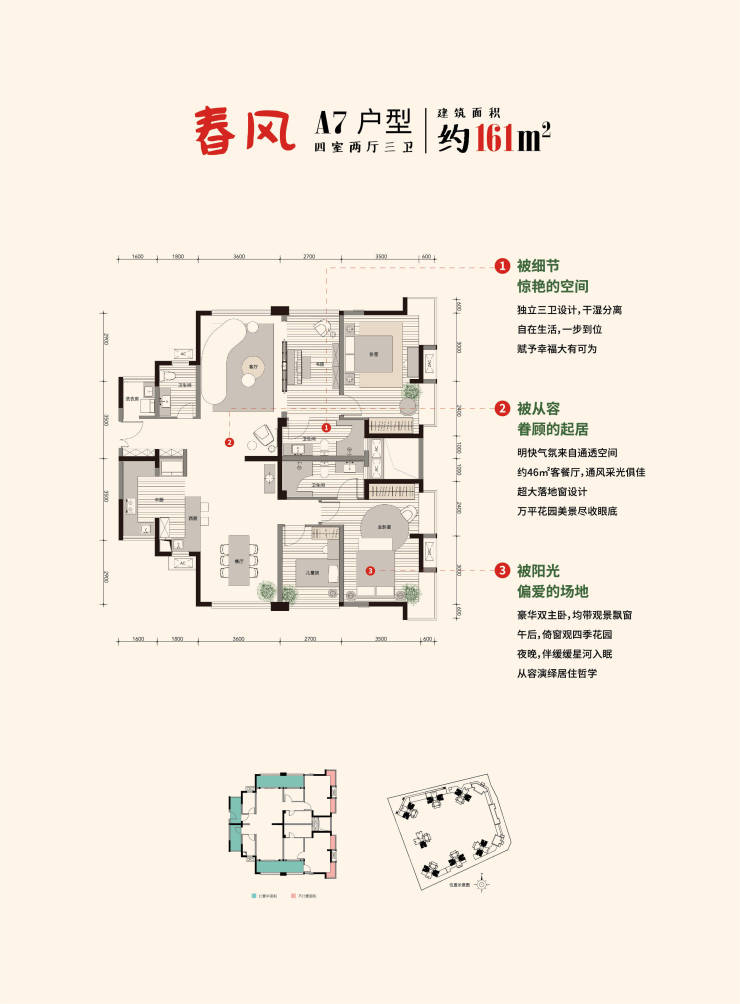 套四(161㎡):大面宽大阳台,功能分区明确,配独立书房、衣帽间,满足改善型家庭品质需求。