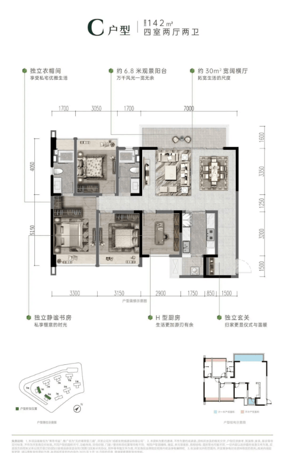 此户型为项目的旗舰产品,采用2梯2户的尊崇配置,私密性极佳。五房两厅的超大尺度,可从容设置主人套房、子女房、老人房及独立书房、多功能室,视野开阔,彰显世家气度,满足高阶人群对空间与身份的终极想象。