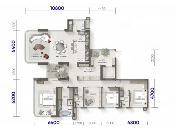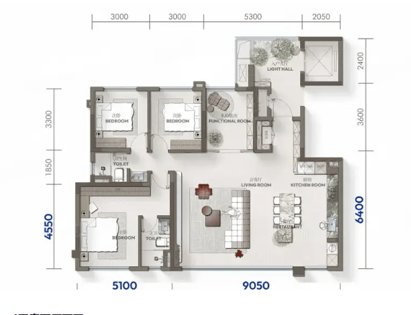 此户型在129㎡的基础上实现了尺度的全面升级,客厅面宽与房间面积更为阔绰。作为社区的主力改善产品,它更好地平衡了家庭社交空间与成员私密空间,适合对居住舒适度和空间感有更高要求的成长型家庭。