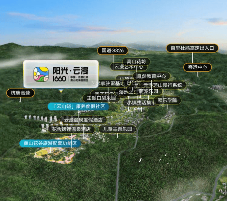 【阳光云漫1660】是由阳光大地集团和百里杜鹃合作打造的大型康养旅游度假区。项目占地约12000亩,其中约8000余亩为主题景区和公建配套设施,约4000余亩为旅游康养度假社区。