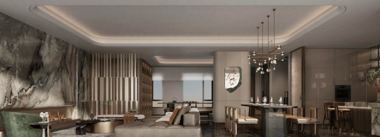 首层双面景观庭院实现花园入户,LDKB一体化厅堂设计同时满足社交宴请与家庭聚会需求。