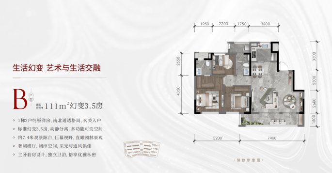 项目为3-11层光幕洋房,1T2户布局,以宽尺度、宽视野、宽格局为标准,将景观、自然、建筑巧妙相融,定义低密人居新高度。
