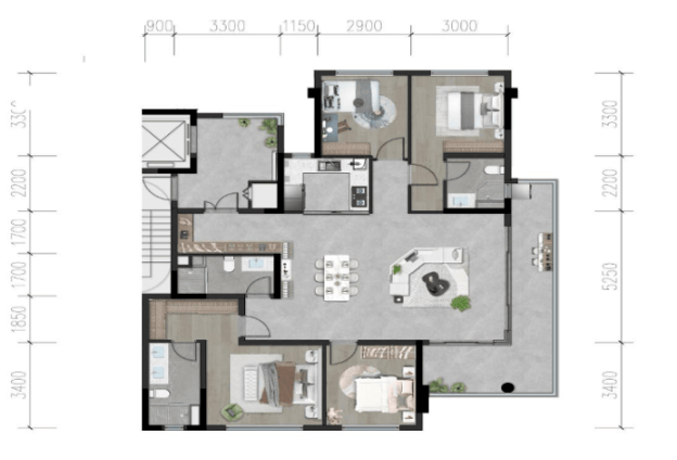 此户型是项目产品力的集中体现,堪称“卷王”。其使用面积约154㎡,设计亮点包括:独立入户的约10㎡电梯前厅(可灵活改造)、约57㎡的餐客厅一体化横厅、总长约12.9米的三面采光阳台以及双主卧套间配置。尤其是第一主卧套房面积约27㎡,配置独立衣帽间,空间尺度与功能细节均向顶级豪宅看齐,实现了“初改级价位、高改级享受”的产品承诺。