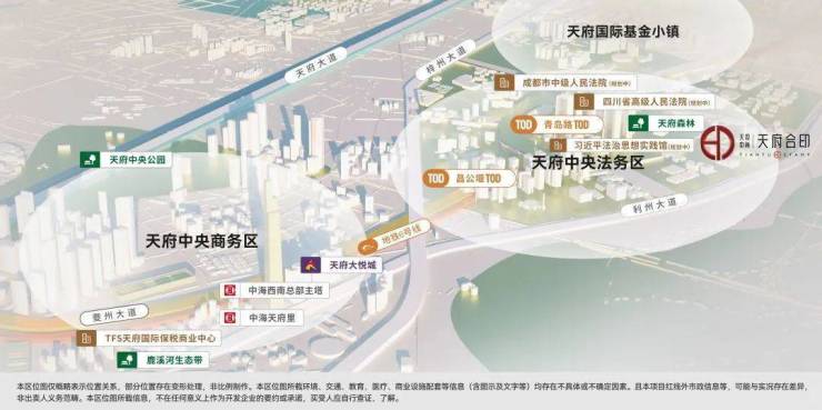 天投中海·天府合印坐落于天府新区核心天府前湾板块,毗邻成熟的天府商务区,北接麓山、西临麓湖等高端住区,占据城市发展黄金区位。作为天府新区核心区收官力作,项目汲取上海前滩、杭州前湾规划精髓,打造"天府森林新绿窗"、"政法服务新高地"、"公园生活新社区"三大功能板块。