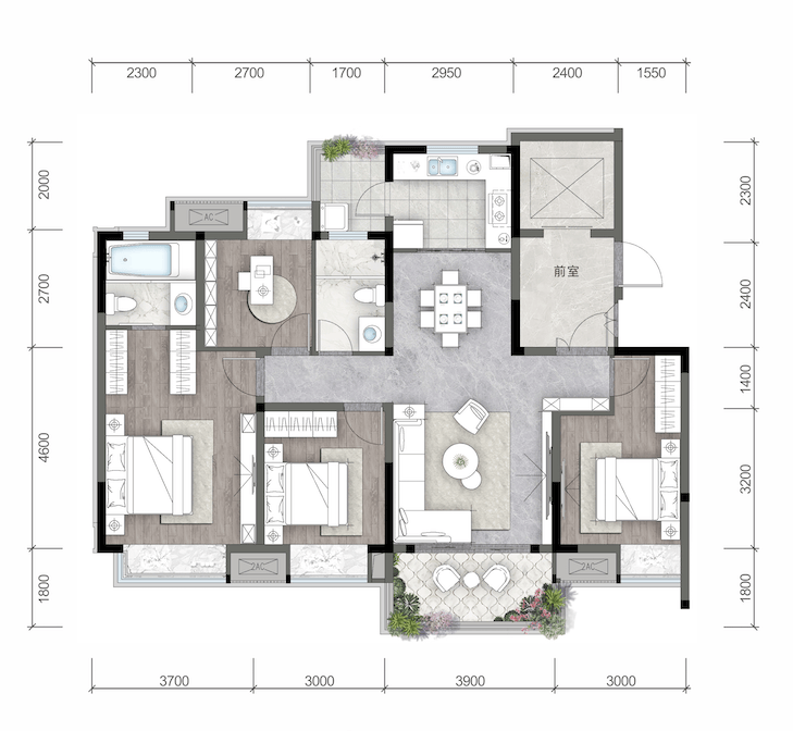 270°采光+超广L型阳台,动静分区,三室+多功能房设计。