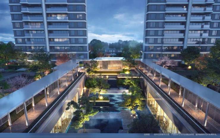 南侧则是8栋2T2/17F小高层建筑,偏向东北-西南朝向。内部园林形成一条景观中轴,沿线布局了约63米宽主大门、酒店式入户大堂、下沉水院会所等设施。