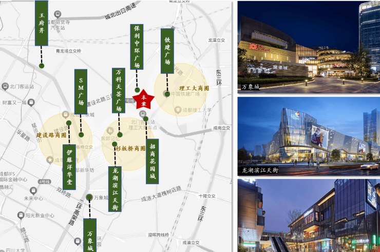 商业:连接杉板桥、建设路、理工大三大商圈,5KM内含万象城、龙湖滨江天街、SM广场等综合商场,实现繁华“零距离”