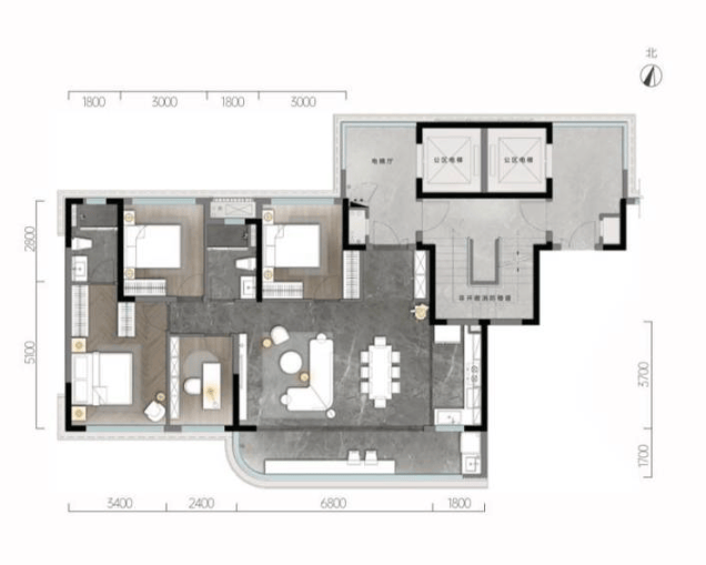 这是项目的旗舰户型,以约14%的低公摊率实现了空间价值的最大化,格局同样为奢阔的四室两厅两卫。整个户型拥有极为阔绰的起居空间和房间尺度,充分体现了高端改善住宅的从容气度。其细节标准与精工品质代表着项目的最高产品力,旨在为城市菁英阶层提供终极的居住体验。